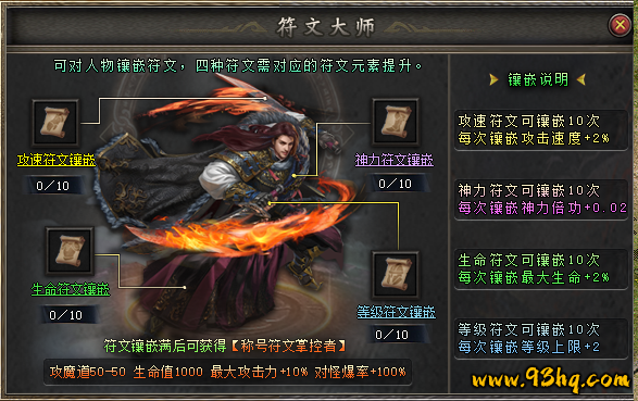 可对人物镶嵌符文,四种符文需对应的符文元素提升。