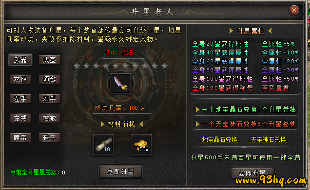 可对人物装备升星,每个装备部位最高可升级十星